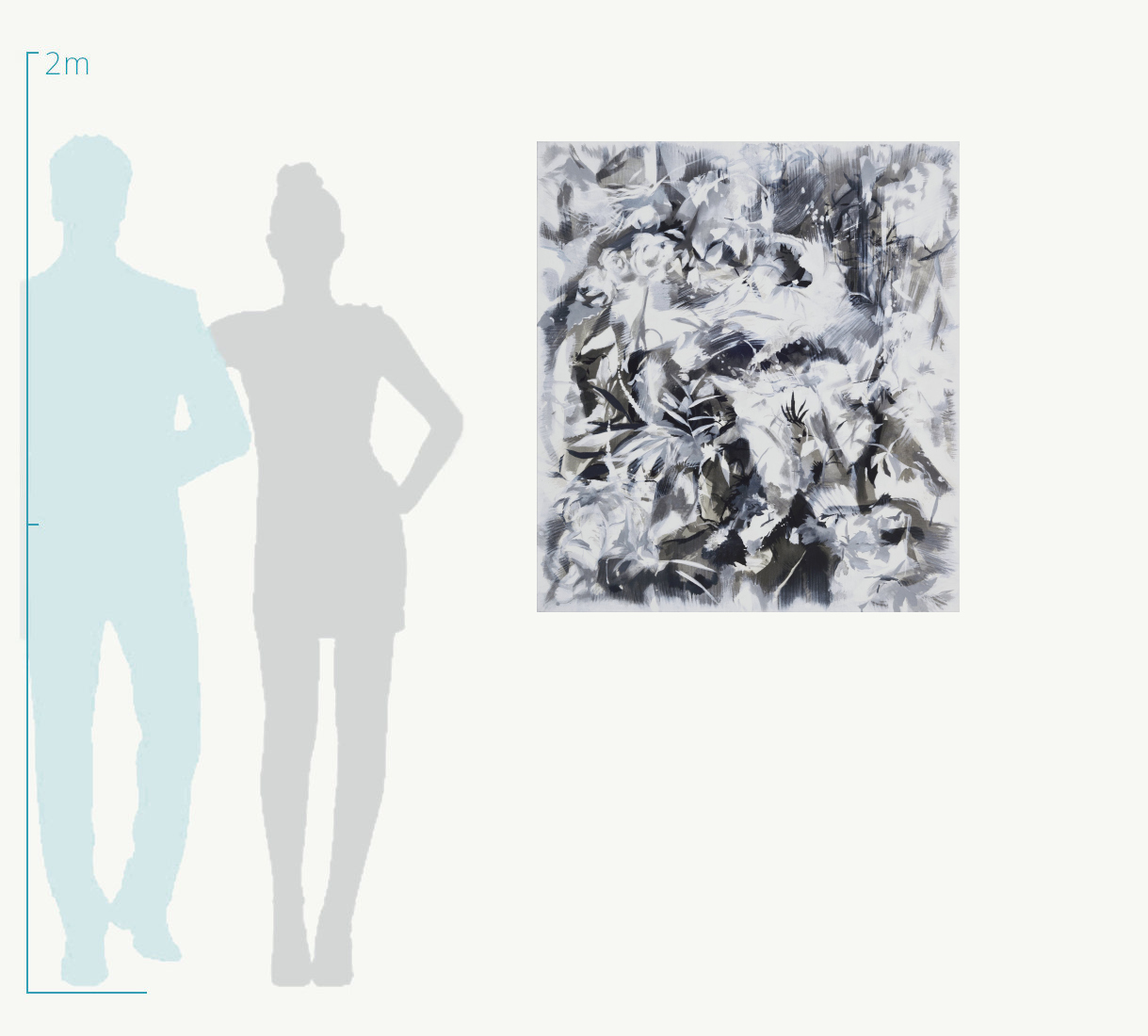 Die Arbeit „In Sonnenfülle taumelnd“ der Werkserie Achromatic Nature canvas 2019-2023 von Tatiana Urban ist quasi der Gegenpol zum auf schwarzem Hintergrund gemalten Werk „Dark mode canvas No 2“: Wo sich im anderen Bild das Weiß seinen Platz erkämpfen musste, erzeugt es hier in seiner Prominenz und Dynamik einen intentionalen Überbelichtungseffekt, auf den die Künstlerin auch im Titel der Arbeit anspielt.