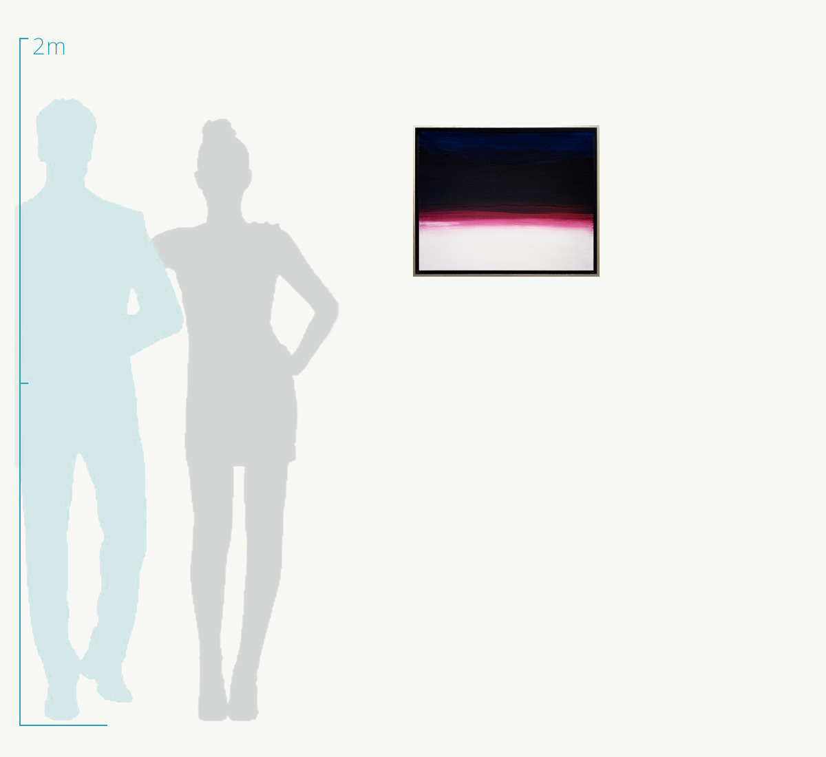 Farbige, meist horizontal verlaufende Flächen, teils mit weichen Übergängen. Die Serie “scapes“ zeigt stark abstrahierte Landschaftsansichten, die keine klar erkennbaren Details zeigen. Sie erscheinen ruhig, menschenleer und entspringen keiner realen Vorlage. Kiesiels Bilder erschliessen sich weniger bei flüchtiger Betrachtung, sondern laden dazu ein, einen Moment Innezuhalten, den Blick weich werden zu lassen, zu Verweilen. Denn nicht die Erfassung von detaillierten Motivinhalten oder Handlungen steht im Vordergrund, sondern die Möglichkeit zur Introspektion, zur Innenschau. Es fragt nach der Bereitschaft besteht sich einzulassen, einzutauchen, Perspektive einzunehmen, ein Fenster nach innen zu öffnen. Was lösen die Bilder beim Betrachten aus? Wie empfindet sich der Betrachter? Das Werk „nightscape“ kommt in einem edlen, schwarzen Schattenfugenrahmen.
