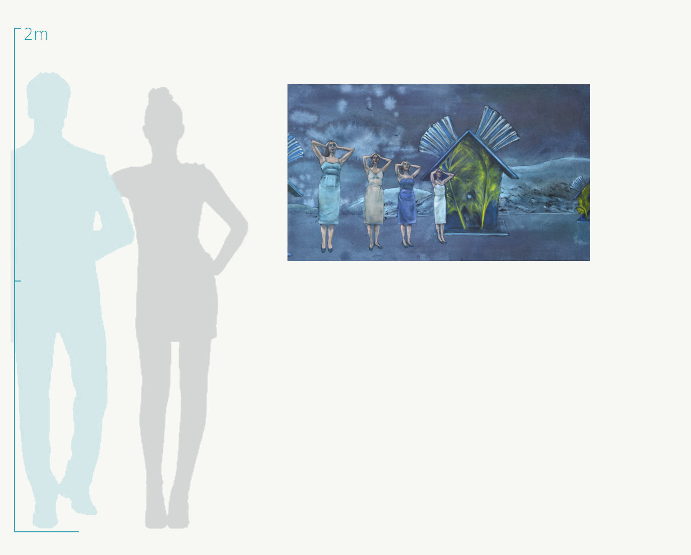 Vom Theater geprägt, interessiert sich Isabel Friedrich für Situationen, in denen es menschelt. In welchen Beziehungen stehen Figuren zueinenander, wie bilden sich zwischenmenschliche Verhältnisse ab, wo sehen wir uns selbst und wie konkretisiert sich dies im Außen? Dabei geht es der Malerin weniger um die Darstellung der Posen, in denen Figuren sich präsentieren und zueinander positionieren. Ihre Interaktion findet im Geist des Betrachters statt.